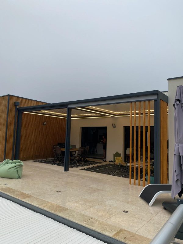 Découvrez notre pergola bioclimatique adossée à trois poteaux double module, la solution idéale pour les grandes terrasses et vos fêtes de famille au soleil ou à l’ombre. Cette structure élégante en aluminium thermolaqué, fabriquée en France et garantie 10 ans, marie esthétique et fonctionnalité. Pilotez facilement l’orientation des lames depuis votre télécommande pour créer l’ambiance parfaite en toute saison. Avec ses options d’éclairage LED, ses stores latéraux et ses capteurs météo, elle transforme votre espace extérieur en un salon sophistiqué où confort et convivialité règnent en maîtres…
